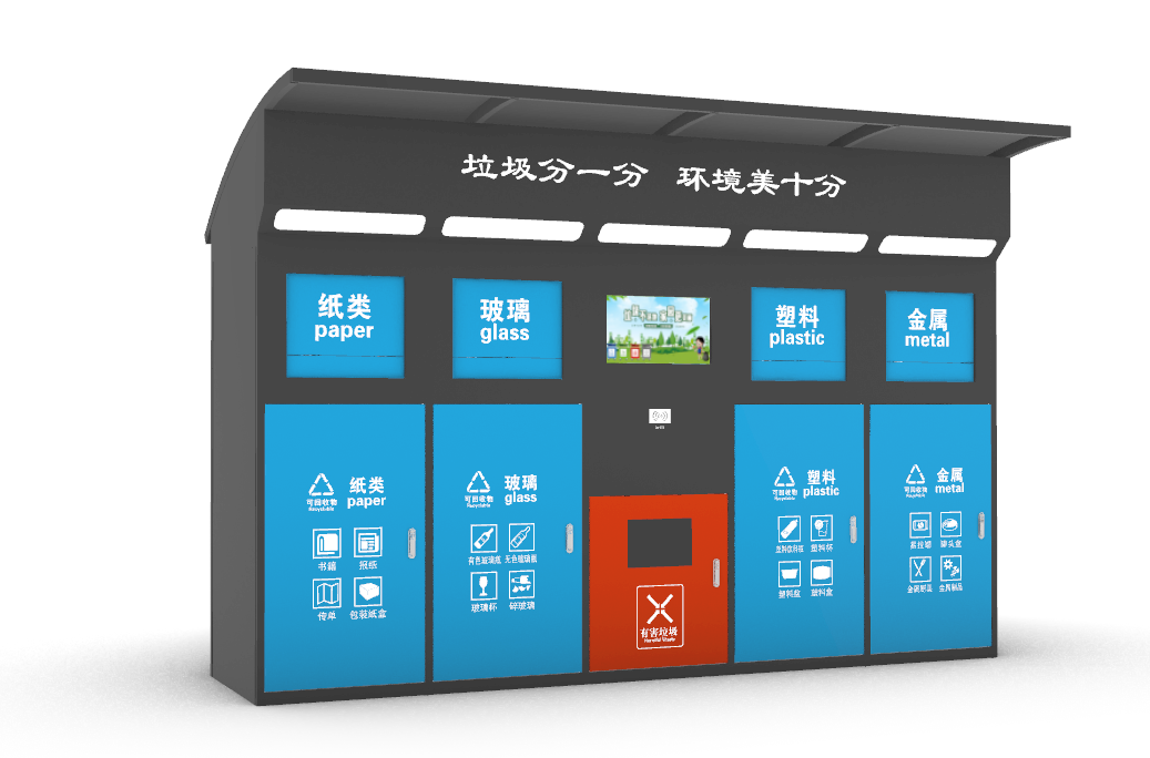 此款智能分類垃圾箱,通過手機APP掃一掃,選擇好要投放的垃圾種類,對應的垃圾箱門自動打開,在投放完成后,自動關閉投放口。全程無需用手接觸垃圾箱體,方便、衛生,減少被細菌污染的機會。在箱體內置自動壓縮系統,當箱體內的垃圾快要滿時,自動感應裝置啟動壓縮功能,將垃圾壓縮成很小的一部份,因此,智能分類垃圾箱能容納更多垃圾,減少環衛工人工作強度。